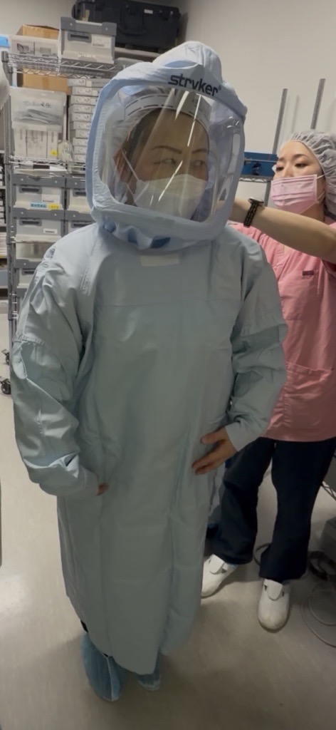 わずか数分の試着でも息が上がるほどで、過酷な環境の中で日々オペに臨まれている医療従事者の皆様のご苦労を肌で感じることができました。